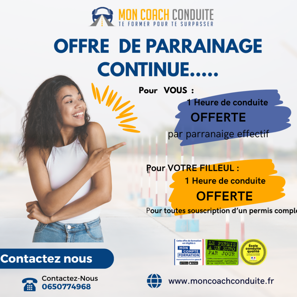 Chez [Nom de l’auto-école], nous récompensons votre fidélité et votre confiance ! Grâce à notre offre exclusive de parrainage, vous bénéficiez, vous et votre filleul, d’une heure de conduite gratuite.